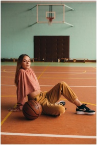 A young woman sits casually on a basketball court,
