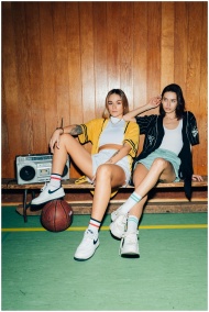 Two stylish women seated in a gym, exuding modern urban fashion with a vintage vibe.