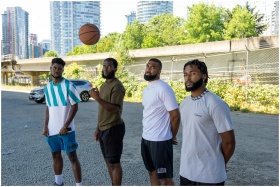Four young men in sporty casual wear with a basketball, standing in an urban outdoor setting.