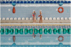 Two swimmers in swimwear holding balls beside an indoor swimming pool, ready for practice.