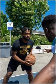 Two men playing basketball outdoors on a sunny day, focused on gameplay.
