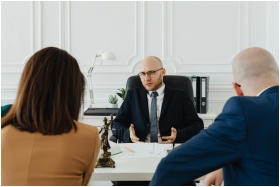 A professional business meeting with a lawyer and clients in a modern office setting.