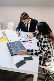 Business professionals analyzing data and collaborating on a project in a modern office setting.