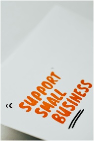 Close-up of a 'Support Small Business' message in orange text on a white paper.