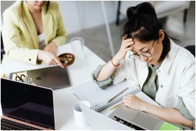 A woman in glasses stressed over work at a laptop, holding her head in an office setting.