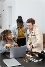 A group of young adults collaborate around a lapto