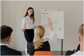 A businesswoman leads a meeting with a graph presentation, engaging her audience. Professional setting.