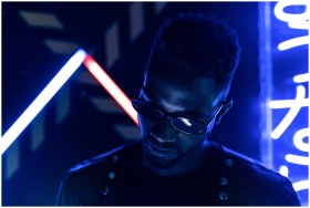 A modern cyberpunk portrait of a man with neon lights and a cool vibe.