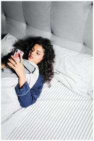 Woman in pajamas lying in bed with a smartphone, relaxing in a cozy bedroom.
