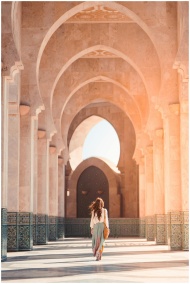 A woman walks through the stunning arches of Hassan II Mosque, Casablanca, highlighting Islamic architecture.