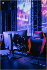 A modern gaming setup featuring a computer monitor and headset in a neon-lit environment.