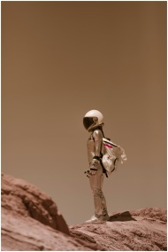 An astronaut in a spacesuit stands alone in a dese