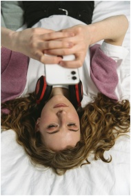 Young woman lying on bed using smartphone, wearing headphones. Relaxed and casual indoor scene.