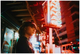 Portrait of young woman standing under neon lights on a vibrant city street at night.
