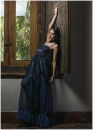 Stylish portrait of a woman in a blue dress leaning by a window indoors.