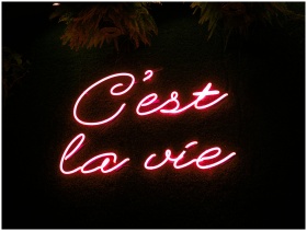 Bright neon sign with 'C'est la vie' phrase in Mon