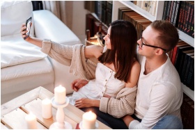 A happy couple taking a selfie indoors, surrounded by candles and books, creating a cozy atmosphere.