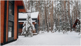 A cozy wooden cabin nestled in a snow-covered fore