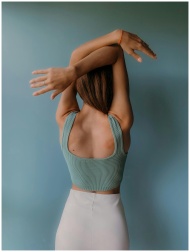 Back view of a young woman stretching her arms in a calm minimalist setting.