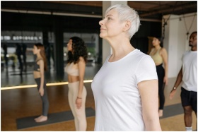 Diverse group practicing yoga indoors, focusing on well-being and mindfulness.