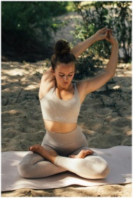 Caucasian woman performing yoga outdoors in a sere