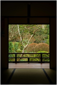 View of a tranquil Japanese garden from a traditio