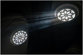 Sun rays illuminate ornate church rose windows, cr