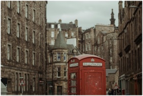 Classic red telephone booth in historic Edinburgh