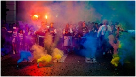 A lively group celebrating at night with color smoke bombs in a street festival.
