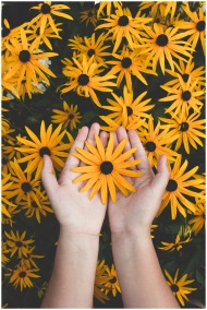 Close-up of hands holding vibrant yellow daisies,