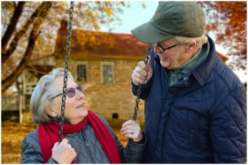 A happy elderly couple sharing a joyful moment on a swing in autumn setting.