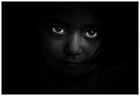 Intense black and white portrait of a child with captivating eyes, evoking mystery and emotion.