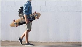 Casual young man walking with longboard against a