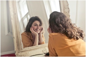 A cheerful woman smiles at her reflection in a vintage-style mirror, exuding positivity and warmth.