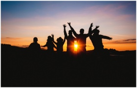 Group of friends silhouetted against a vibrant sunset sky, celebrating together outdoors.