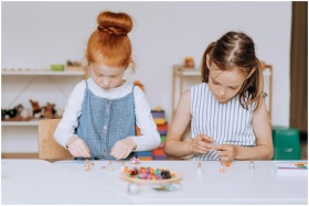 Two young girls actively engaged in a creative project at a classroom table, fostering education and creativity.