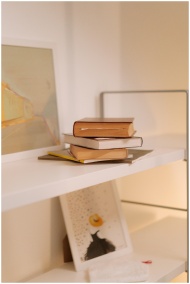 A stylish shelf displaying stacked books and art within a minimalist interior.