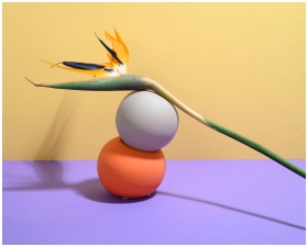 Bright Bird of Paradise flower balanced on geometric shapes against colorful backdrop.