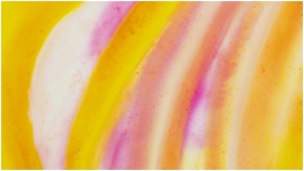 A vivid abstract painting with flowing pink and yellow hues in watercolor style.