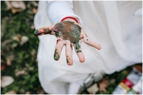 A child's hand covered in paint during outdoor pla
