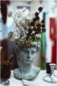 Artistic statue vase with dried flowers on a white table indoors, creating a vintage aesthetic.