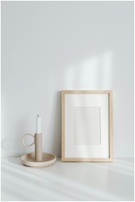 Elegant minimalist composition featuring a candle beside an empty wooden frame in soft light.
