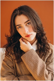 Elegant portrait of a young woman wearing a plaid coat against a terracotta backdrop.
