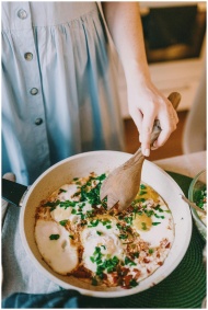 A chef preparing Shakshuka with eggs, tomatoes, and herbs in a skillet.