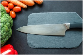 Close-up of fresh vegetables with a chef's knife on a rustic slate board.