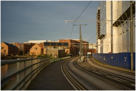 Symmetrical view of modern buildings framing a dis