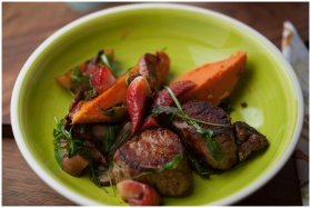 Delicious gourmet dish featuring roasted meat and vegetables in a vibrant bowl.