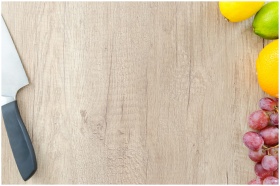 Colorful display of citrus fruits and grapes on a wooden board with knife.