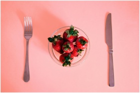 Bright strawberries in a bowl, laid out with silverware on a pastel pink surface. Perfect for a fresh dining concept.