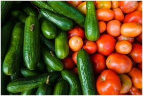 A vibrant display of juicy cucumbers and ripe tomatoes at a local market.